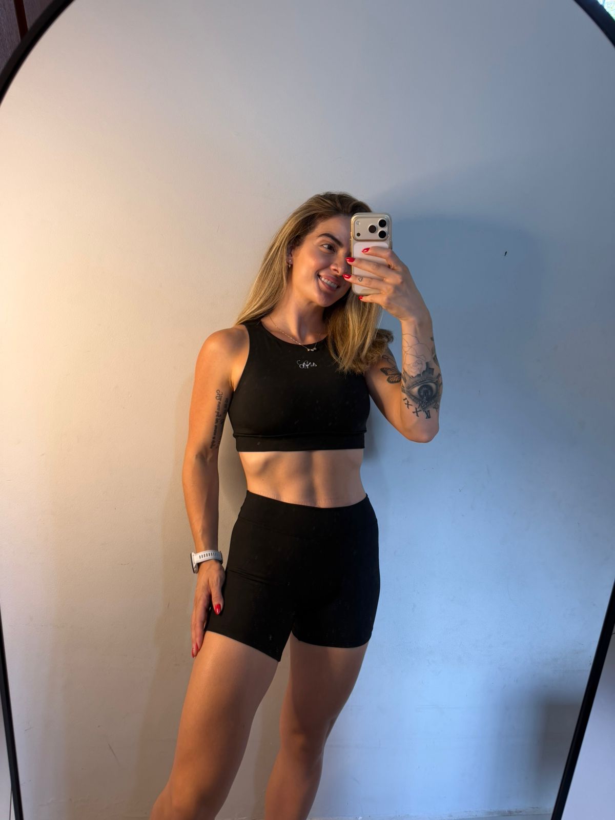 Conjunto fitness em poliamida premium, com top cropped e short de cintura alta.